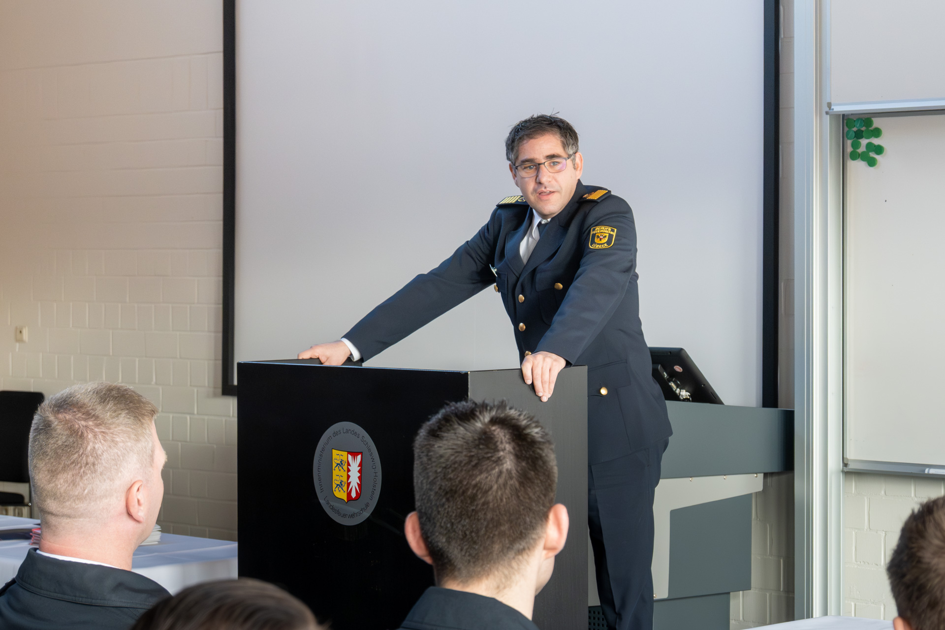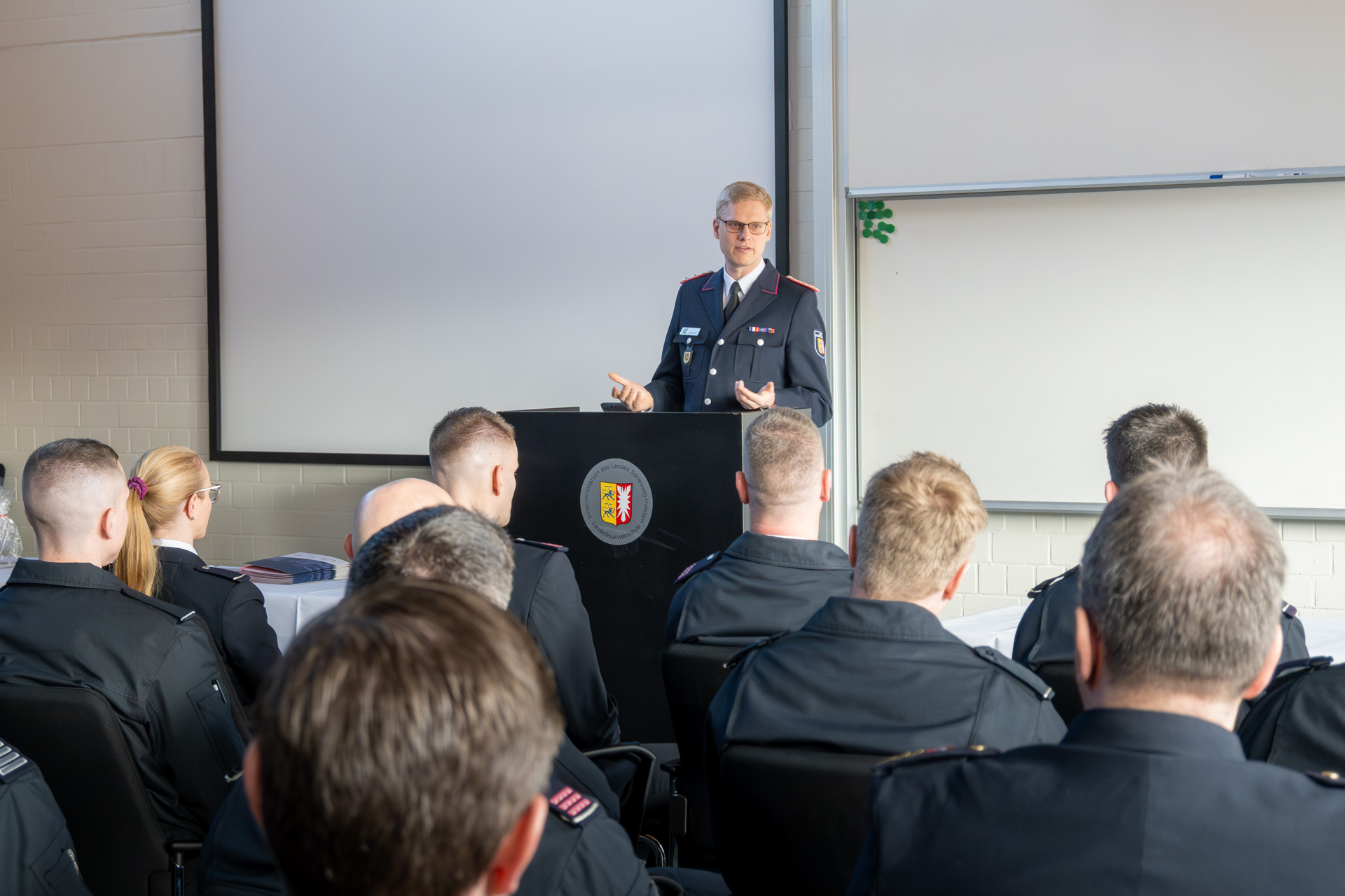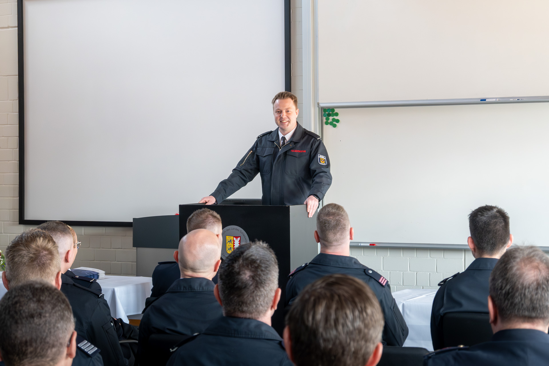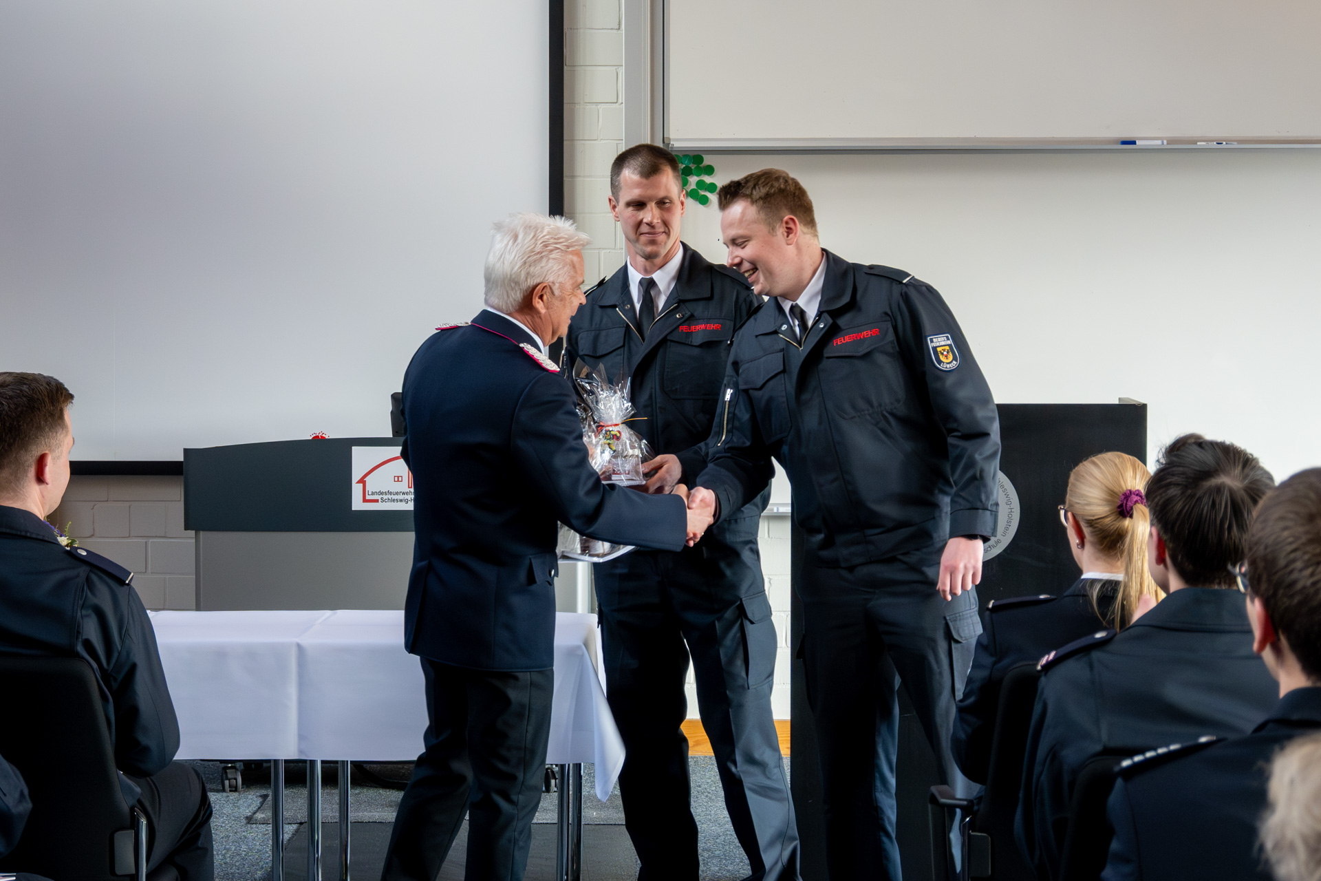 Thomas Köstler (Berufsfeuerwehr Lübeck), Leiter der AGBF Schleswig-Holstein und Holger Menge (Berufsfeuerwehr Neumünster) als Sprecher der Personalräte der schleswig-holsteinischen Berufsfeuerwehren, richteten ebenfalls das Wort an die Zuhörerschaft und gratulierten zu den bestandenen Prüfungen.