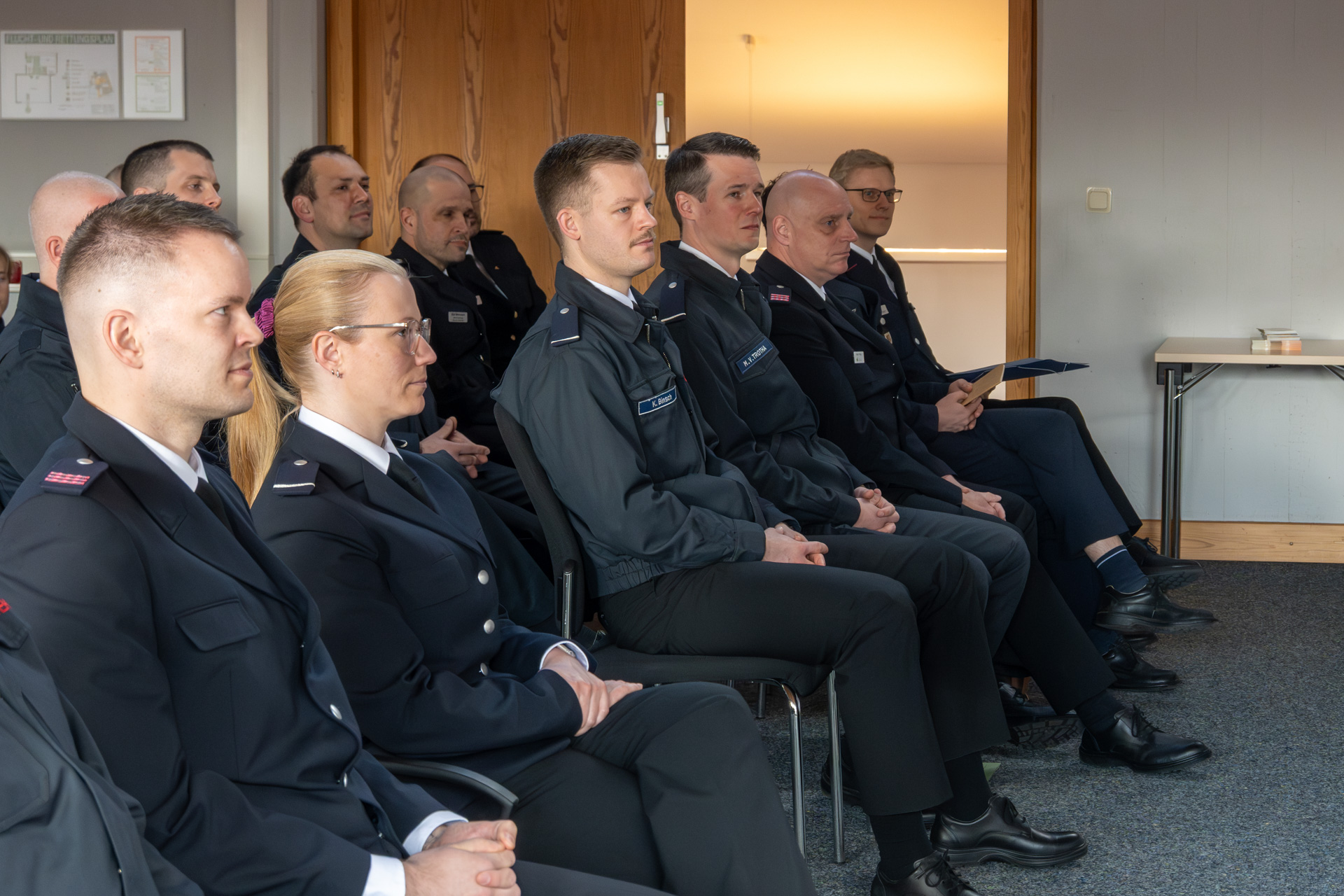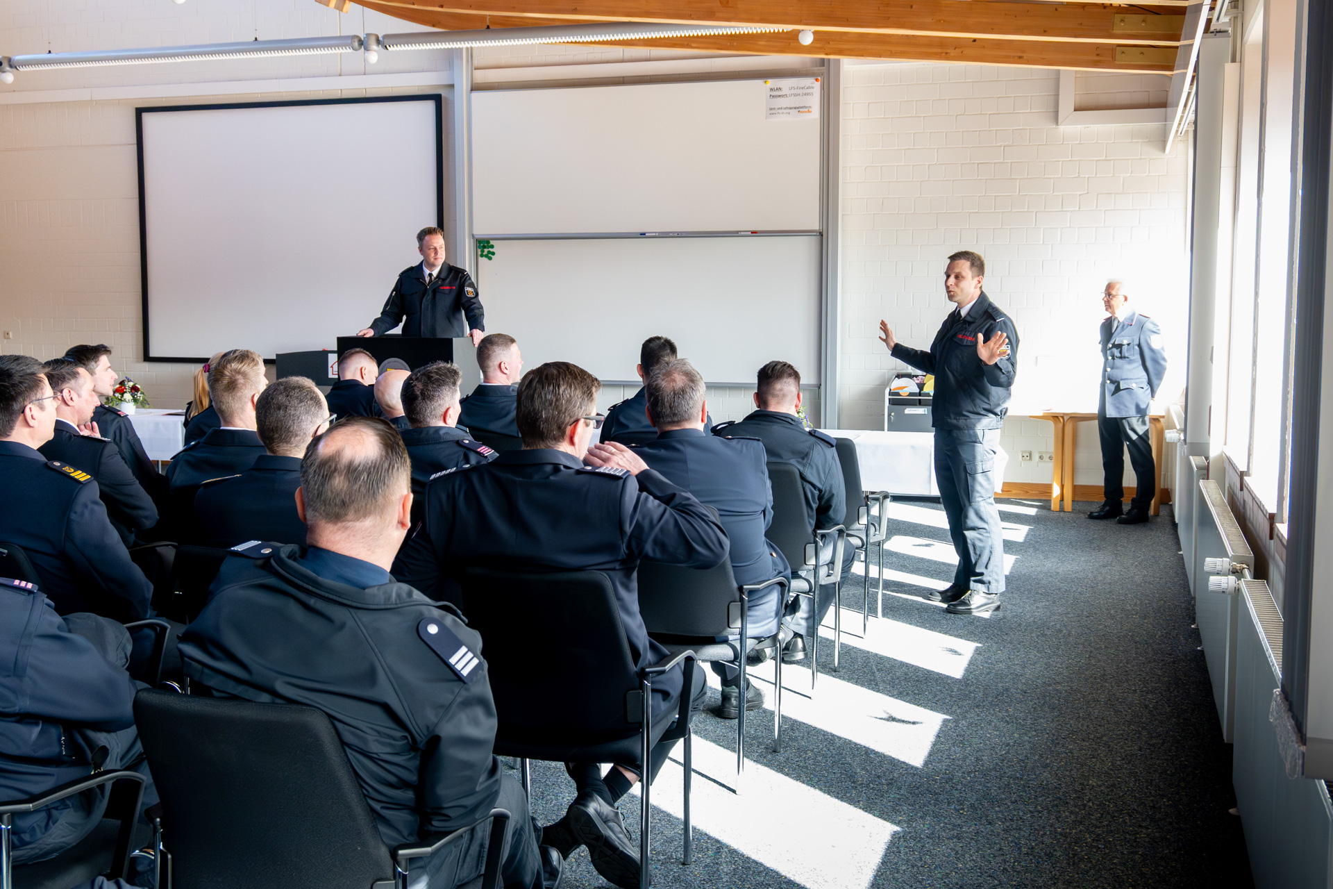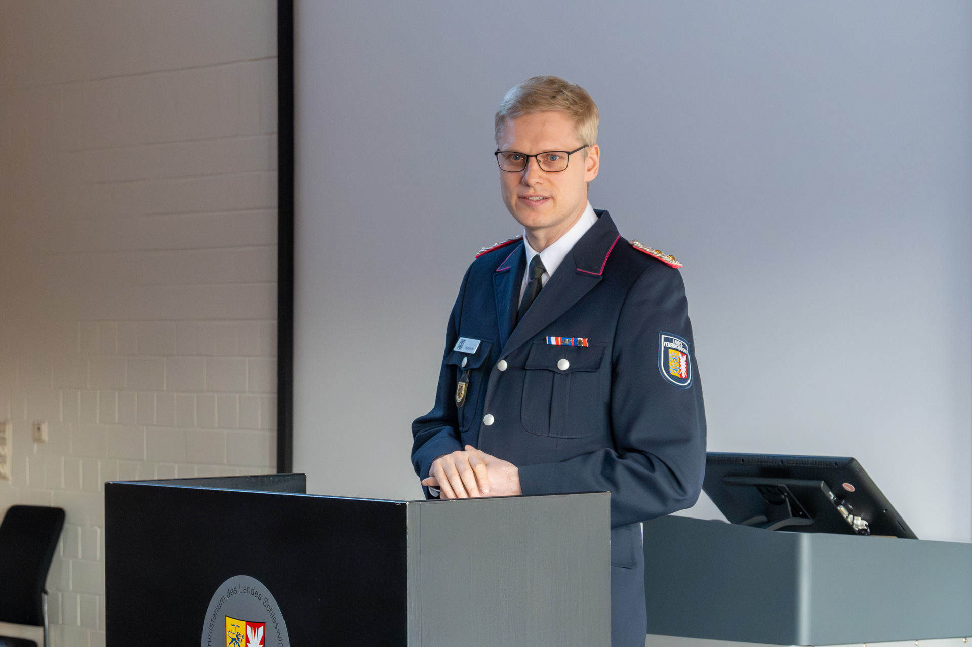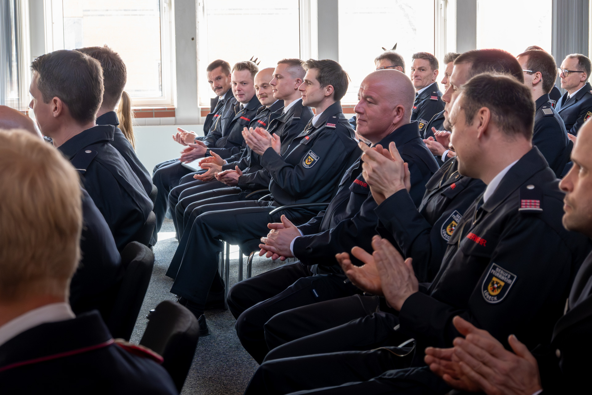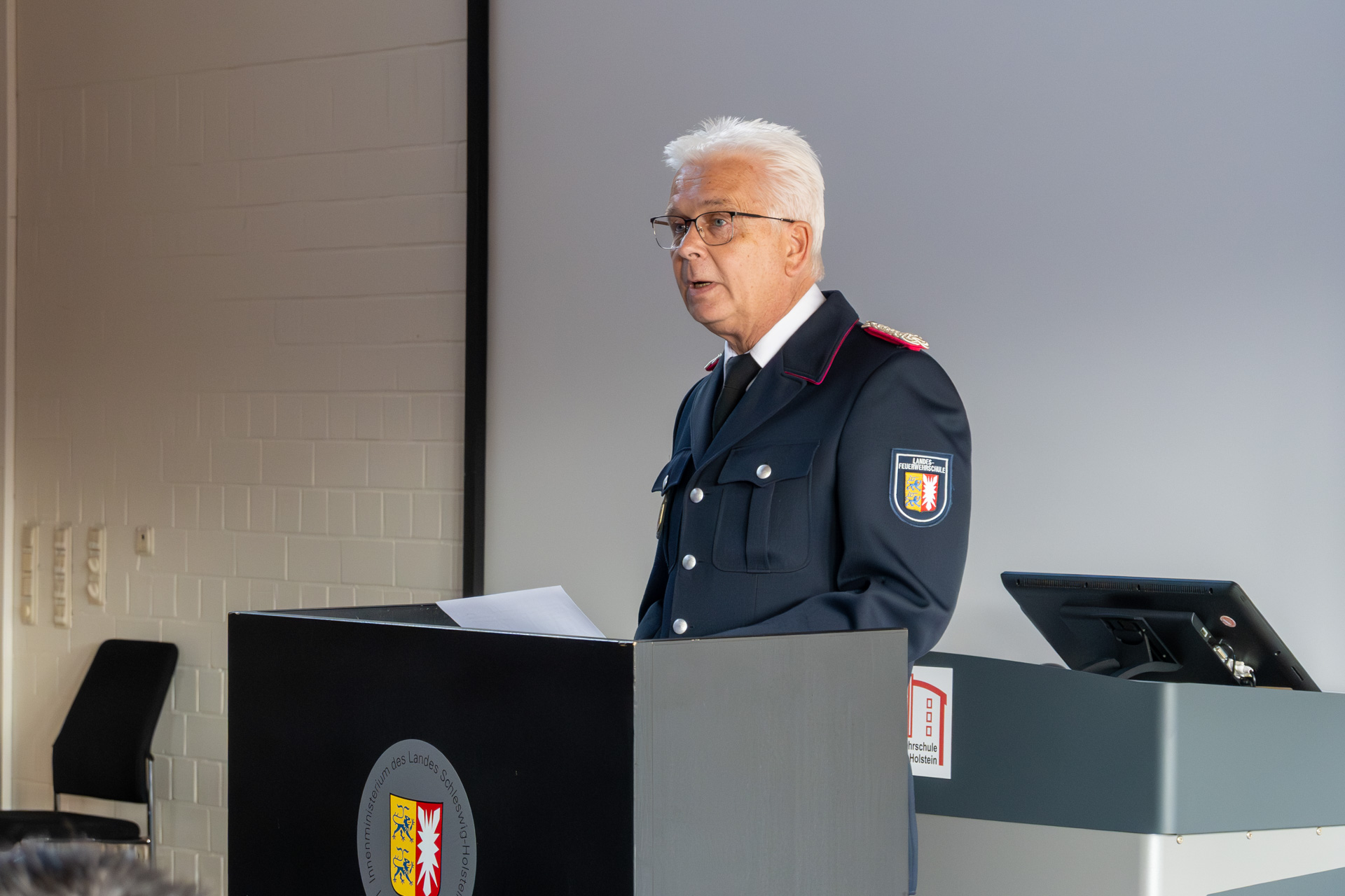 Thomas Köstler (Berufsfeuerwehr Lübeck), Leiter der AGBF Schleswig-Holstein und Holger Menge (Berufsfeuerwehr Neumünster) als Sprecher der Personalräte der schleswig-holsteinischen Berufsfeuerwehren, richteten ebenfalls das Wort an die Zuhörerschaft und gratulierten zu den bestandenen Prüfungen.