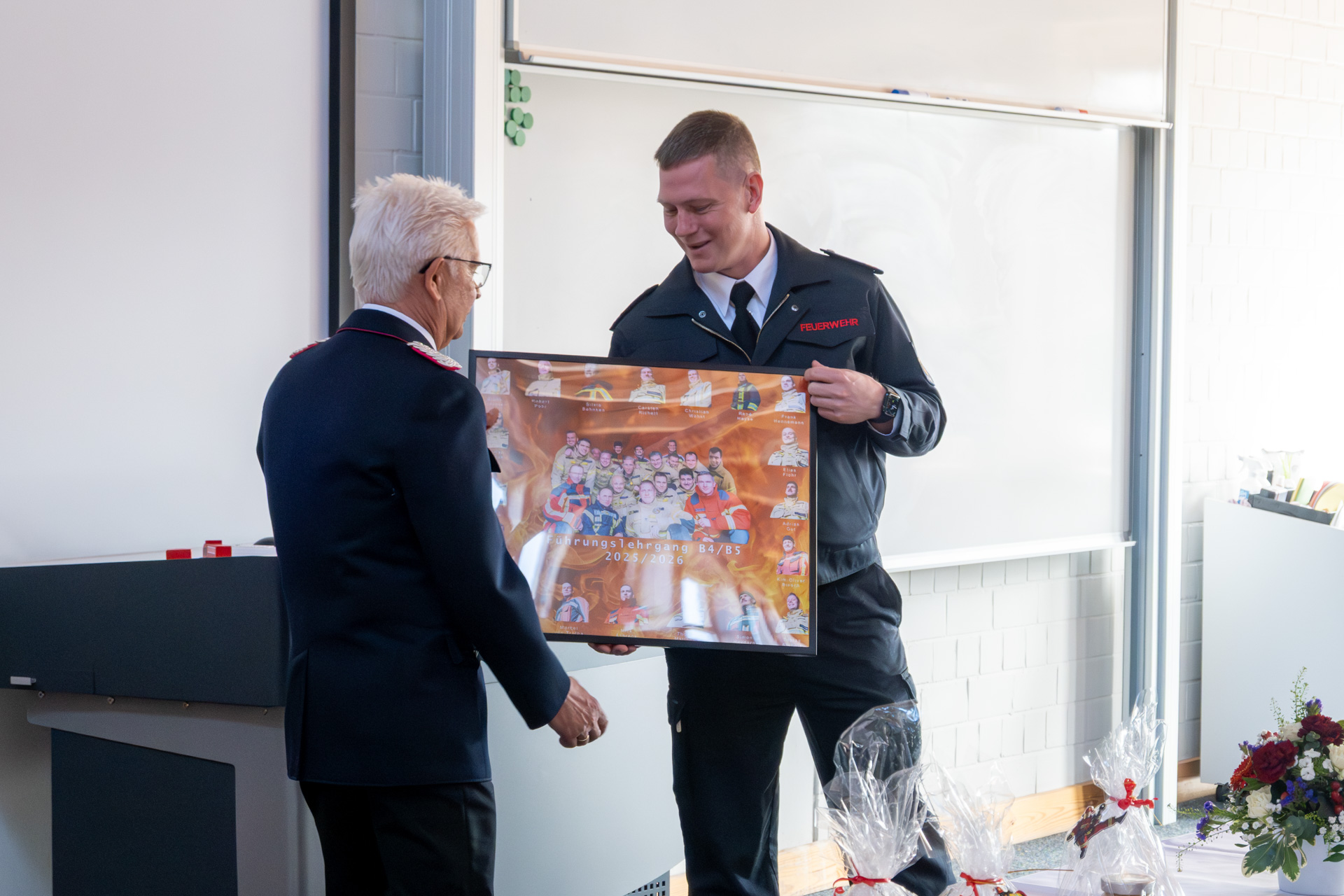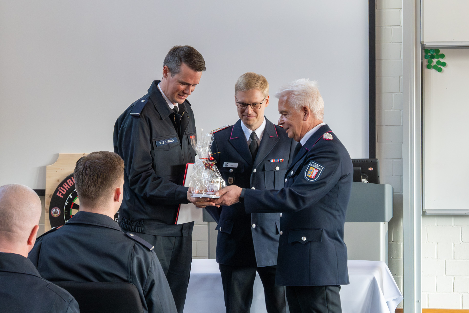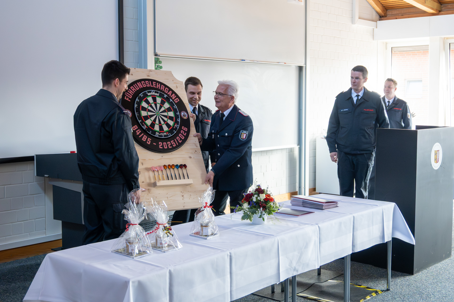 Tobias Ahrholz ließ im Rahmen eines Rückblicks die vergangenen Ausbildungsmonate Revue passieren. Er dankte den Ausbildern im Namen aller Lehrgangsteilnehmerinnen und -teilnehmer, die im Anschluss als Andenken ein Lehrgangsfoto sowie eine eigens entworfene Dartscheibe zur Ausstattung des Aufenthaltsraumes in der Landesfeuerwehrschule überreichten.